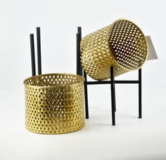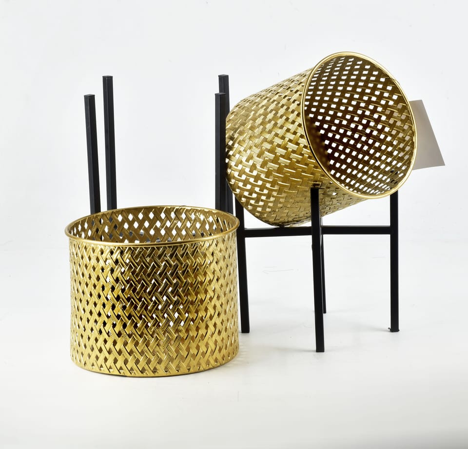Komplet 2 złotych osłonek z serii SWEN marki MONDEX. Połączenie złota i tłoczonego wzoru - splotu sprawia iż sprawdza się w każdym nowoczesnym i eleganckim wnętrzu nadając mu szyku. Najmodniejszy look ostatniej dekady! wymiary całości: XL: 20xh36,5cm L: 18xh29cm osłonka L: 20xh15,5c stojak h30/nóżki h20cm osłonka M: 18xh16cm stojak h20cm/nóżki h13cm posiadają osobne czarne stojaki