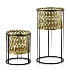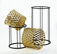 Komplet 2 osłonek ażurowych z serii SWEN marki MONDEX. Połączenie złota i czerni ażuru sprawia iż sprawdza się w każdym nowoczesnym i eleganckim wnętrzu nadając mu szyku. Najmodniejszy look ostatniej dekady! wymiary całości: XL: 20xh40cm L: 18xh22,5cm osłonka XL: 20xh15cm stojak h39,5cm osłonka L: 18xh15cm stojak h22cm