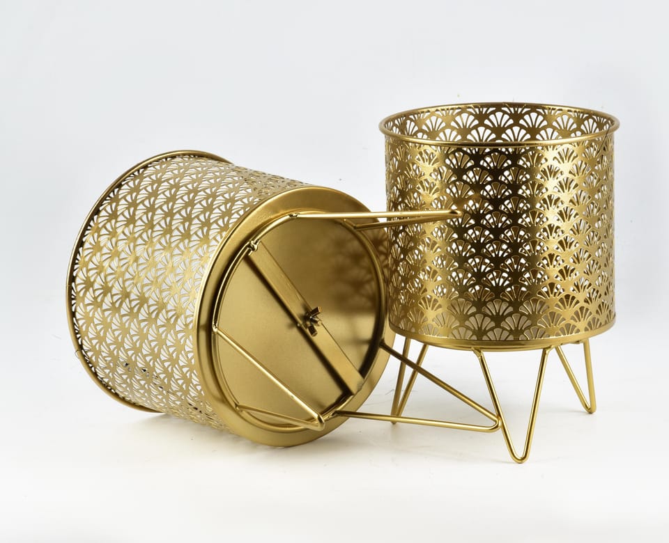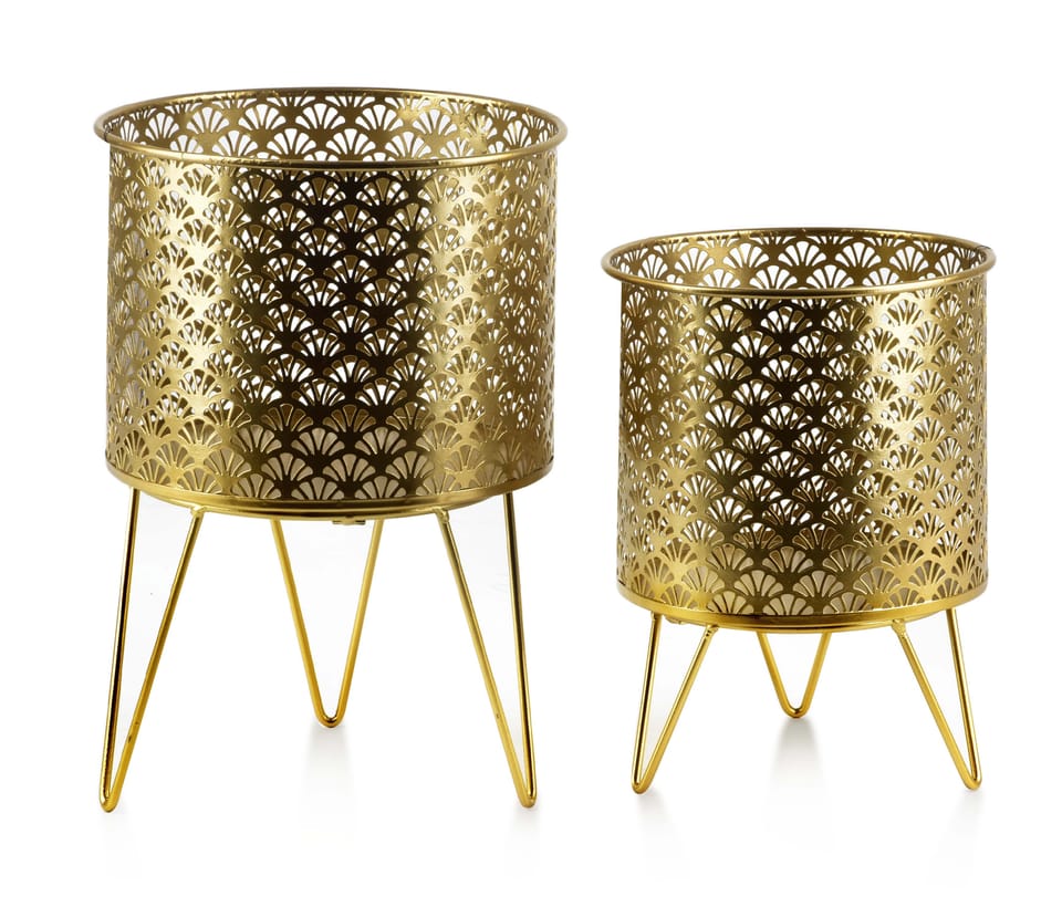 Komplet 2 osłonek ażurowych z serii SWEN marki MONDEX. Połączenie złota i ażuru sprawia iż sprawdza się w każdym nowoczesnym i eleganckim wnętrzu nadając mu szyku. Najmodniejszy look ostatniej dekady! wymiary całości:L: 20xh29,5cmM: 18xh23,5cmosłonka L: 20xh15cm nóżki h14,5osłonka M: 18xh15cm nóżki h8,5cm