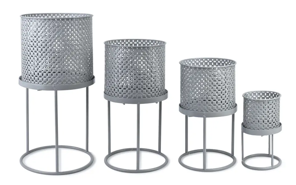 Komplet 4 osłonek na stojaku z serii SWEN marki MONDEX. Przepiękne ażurowe wykończenie nada stylu w każdym pomieszczeniu. wymiary XL: średnica:25 cm wysokość doniczki:20 cm wysokość całości: 46 cm wymiary L: średnica:18,5 cm wysokość doniczki:16,5 cm wysokość całości: 37,5 cm wymiary M: średnica:17 cm wysokość doniczki:14,5 cm wysokość całości: 30,5 cm wymiary S: średnica:11,5 cm wysokość doniczki:11 cm wysokość całości: 22 cm