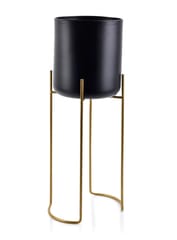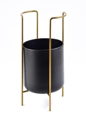 SWEN osłonka na stojaku marki Mondex. Wykonana z metalu w kolorze czarnym. Jest osadzona na stojaku w kolorze złotym. wymiary całości: długość: 20cm szerokość: 20cm wysokość: 54cm wymiary doniczki: długość: 18.7cm szerokość: 18.7cm wysokość: 20cm 1