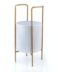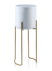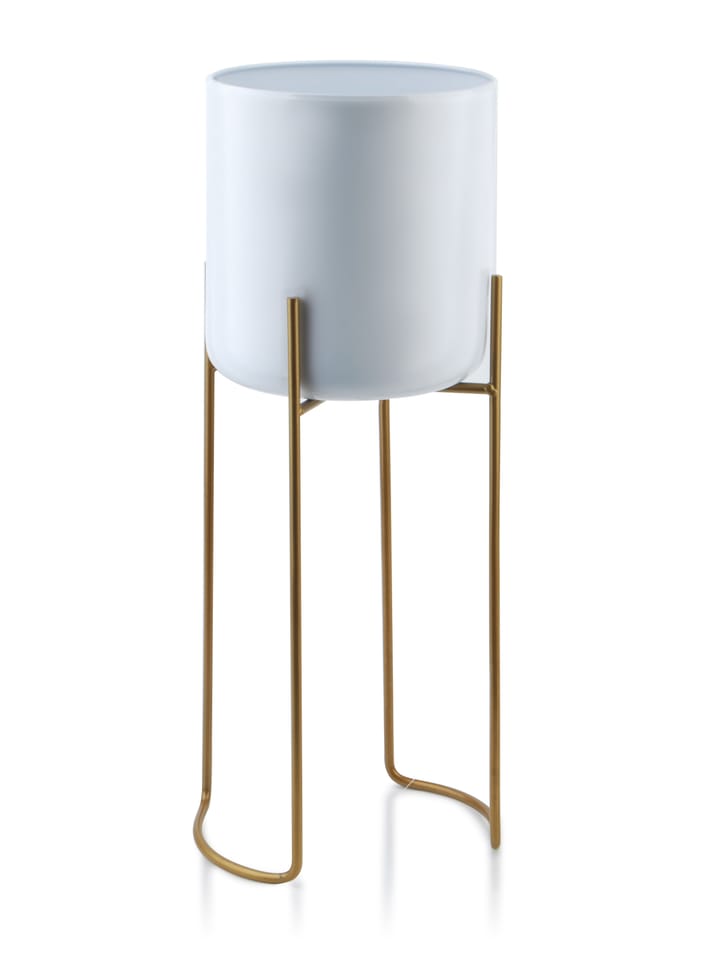 SWEN osłonka na stojaku marki Mondex. Wykonana z metalu w kolorze białym. Jest osadzona na stojaku w kolorze złotym. wymiary całości: długość: 20cm szerokość: 20cm wysokość: 54cm wymiary doniczki: długość: 18.7cm szerokość: 18.7cm wysokość: 20cm