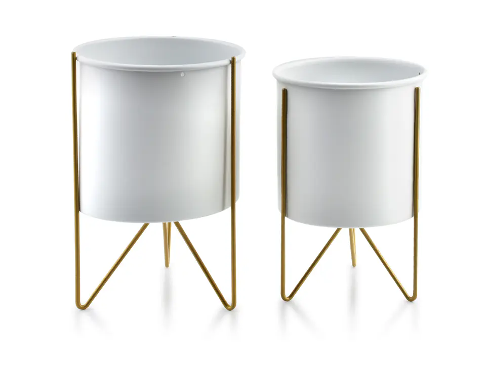 Komplet dwóch osłonek na stojaku z kolekcji SWEN marki MONDEX. Biała osłonka umocowana na złotym stelażu. Idealna dekoracja każdego wnętrza czy tarasu. XL: średnica całości: 18 cm wysokość całości: 26 cm średnica doniczki: 18 cm wysokość doniczki: 16 cm L: średnica całości: 16 cm wysokość całości: 23 cm średnica doniczki: 16 cm wysokość doniczki: 14,5 cm