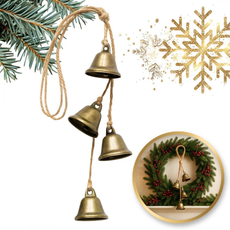 Metalowe dzwonki, ozdoba świąteczna - zestaw 4 szt. W przedświątecznym okresie pełnym przygotowań każdemu przyda się chwila wytchnienia.Wprowadź magię Bożego Narodzenia do swojego wnętrza.Ta urocza dekoracja wprowadzi wyjątkowy akcent do każdego pomieszczenia.Jest trwała i zachowuje swój kształt, dzięki czemu będzie cieszyć oko przez cały sezon świąteczny. Wymiary: długość - 40 cm Waga:35,5 g brutto Poczuj klimat Świąt!