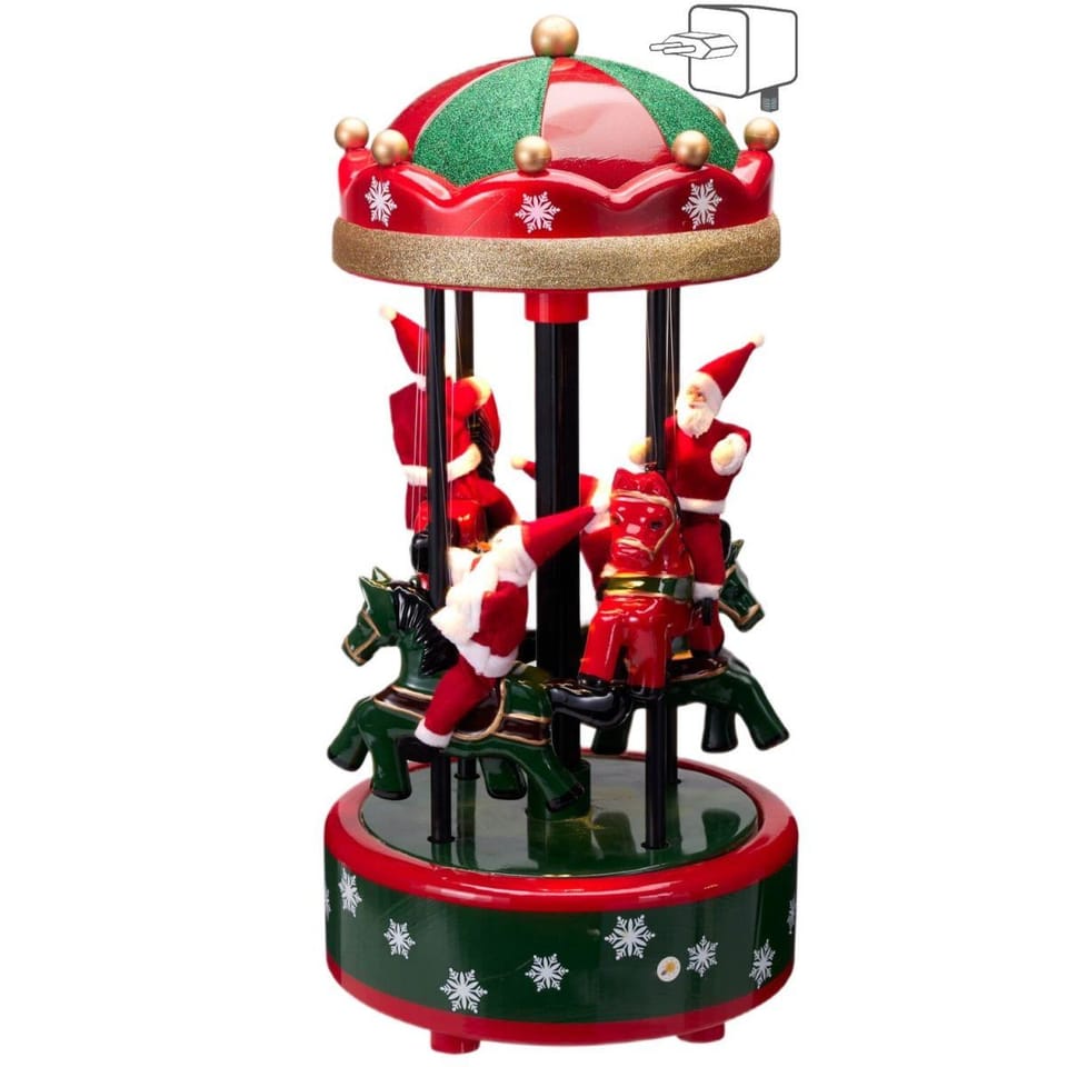 - efektowna ozdoba - karuzela z figurkami Mikołai i bałwanówwyposazona w 8 diod LED emitujących ciepłe, białe światłozasilacz 9,0 V / 1,0 A w zestawie zapewnia działanie bez potrzeby użycia bateriiwysokość aż 60 cm, idealna jako centralna ozdoba stołu lub komodymelodia „Jingle Bells” wprowadza klasyczny świąteczny klimatruchoma konstrukcjaidealna na prezent