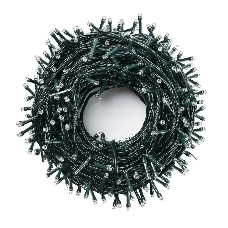 DEKORACYJNE ŚWIATEŁKA LAMPKI NA BOŻE NARODZENIE Długość zestawu: 30metrów + 1,2m kabel500 światełek LED. Światełka w kolorze ZIMNY BIAŁY + BIAŁY FLASH. Światełka wewnętrzne / zewnętrzne.Kolor kabla - ciemna zieleń.Przewody można łączyć ze sobą. Kolor opakowania może się różnić w zależności od dostawy.