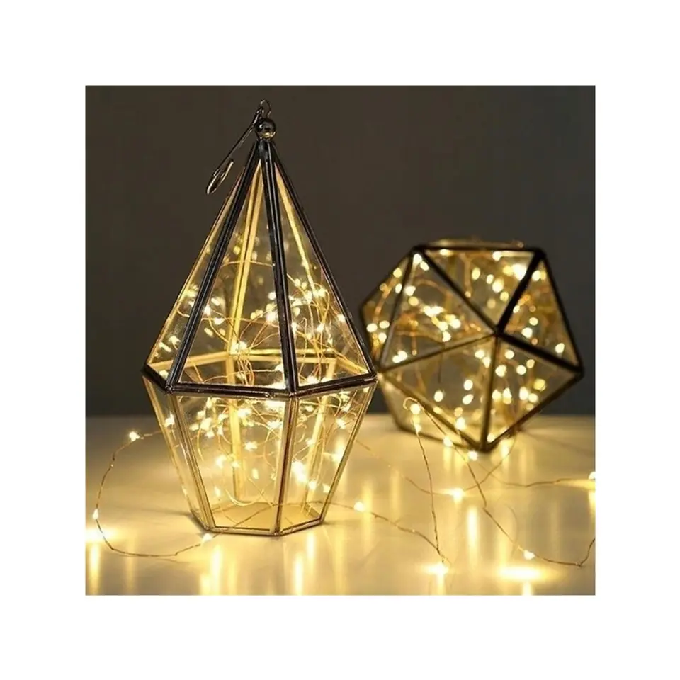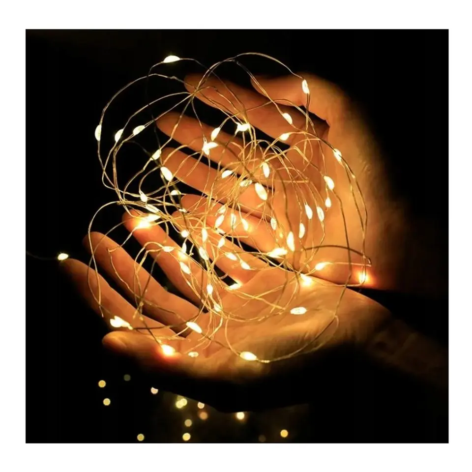 DEKORACYJNE ŚWIATEŁKA LAMPKI NA BOŻE NARODZENIELEDOWE OŚWIETLENIE NA DRUCIKU – tworzy wyjątkową i niepowtarzalną dekorację każdego wnętrza.Lampki wykonane z giętkiego druciku, który umożliwia dowolne kształtowanie na dekorowanym miejscu. Lampki 50 LEDBarwa światła - biała ciepła Diody osadzone są na srebrnym druciku.Cieniutki drucik daje się łatwo układać w dowolny kształt.Zasilanie na 2 baterie AA ( opakowanie nie zawiera baterii). Wymiary: 5m Idealne do różnego typu dekoracji, stroików, kwiatów, aranżacji, itp.