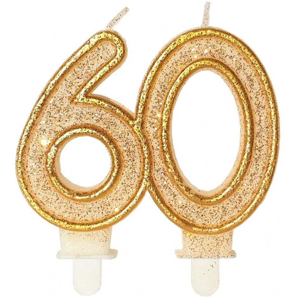 Zlota, brokatowa świeczka z liczbą 60 to idealny dodatek do uroczystości urodzinowych.