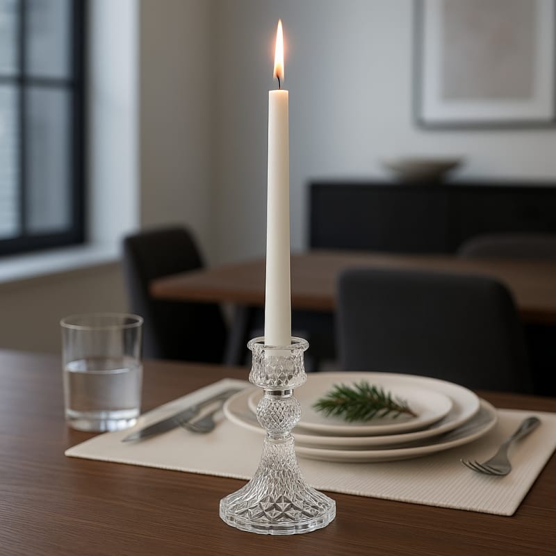 Świecznik dekoracyjnyElegancki świecznik szklany został zaprojektowany, by stabilnie utrzymywać świeceo średnicy do 2,3 cm — idealny do świec stożkowych, filarowych i cylindrycznych.Kryształowy wzór dodaje mu klasy i sprawia, że pięknie prezentuje się na stole,komodzie czy parapecie.Materiał: Szkło Wymiary:Wysokość: 10 cmSzerokość: 8 cm Wymiary opakowania:10,5cm x 8cm x 8cm Waga: 153g netto / 185g brutto