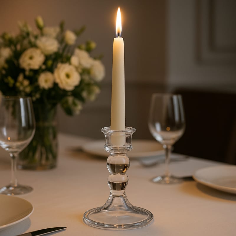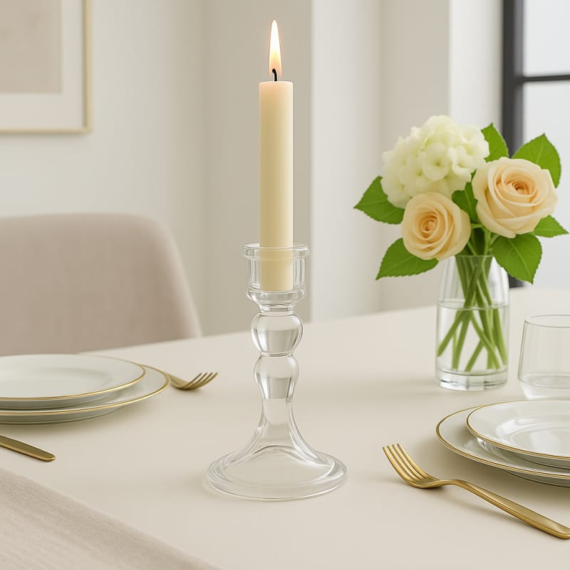 Świecznik dekoracyjny Elegancki świecznik szklany został zaprojektowany, by stabilnie utrzymywać świeceo średnicy do 2,3 cm — idealny do świec stożkowych, filarowych i cylindrycznych.Kryształowy wzór dodaje mu klasy i sprawia, że pięknie prezentuje się na stole,komodzie czy parapecie. Materiał: SzkłoWymiary:Wysokość: 12,5 cmSzerokość: 8 cm Wymiary opakowania:13cm x 8,5cm x 8,5cm Waga: 194g netto / 227g brutto