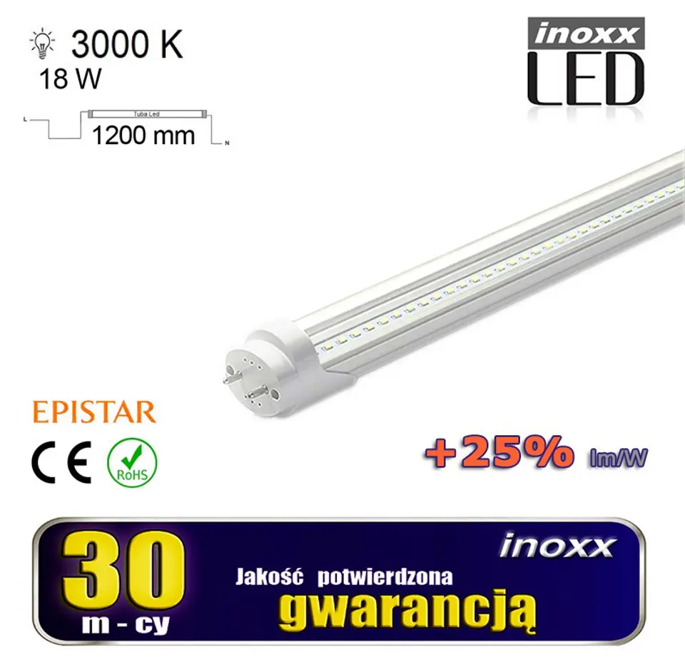 ŚWIETLÓWKA LED 120CM 18W T8 3000K G13 CIEPŁA PRZEZROCZYSTA DWUSTRONNA