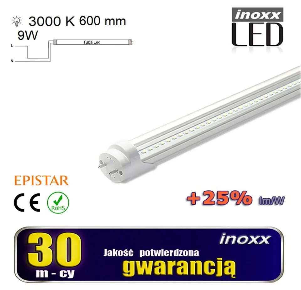 ŚWIETLÓWKA LED 60CM 9W T8 3000K G13 CIEPŁA PRZEZROCZYSTA JEDNOSTRONNA
