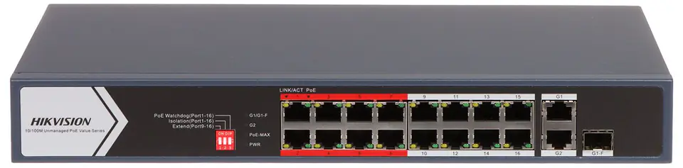 | Porty lan: | 16 x RJ45 10/100 Base-T ( 16 x PoE (802.3af/at) ), 1 x port Combo: SFP (1000 Base-X) / RJ45 (10/100/1000 Base-T) - Uplink, 1 x RJ45 10/100/1000 Base-T - Uplink |