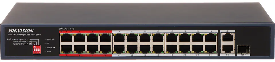 | Porty lan: | 24 x RJ45 10/100 Base-T ( 24 x PoE (802.3af/at) ), 1 x port Combo: SFP (1000 Base-X) / RJ45 (10/100/1000 Base-T) - Uplink, 1 x RJ45 10/100/1000 Base-T - Uplink |