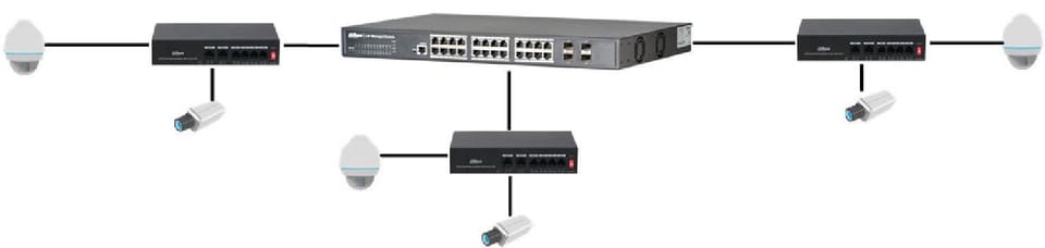 Dzięki niezawodności i zapewnieniu wysokiej jakości transmisji, 4-portowy przełącznik PoE PFS3006-4ET-36 10/100 Mb/s typu desktop stanowi idealne rozwiązanie do rozbudowy domowej lub biurowej sieciCztery porty obsługują funkcję Power over Ethernet (PoE)