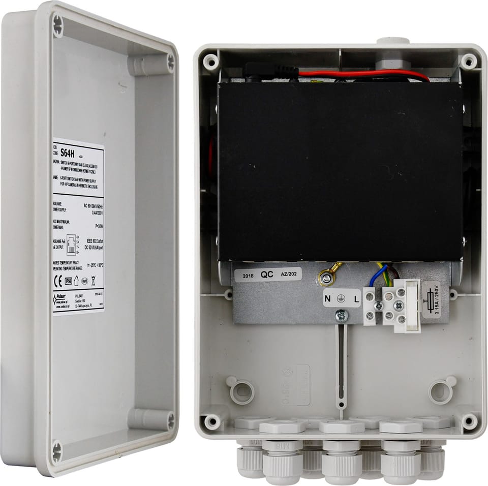 Switch S-64H jest przeznaczony do zasilania kamer IP pracujących w standardzie IEEE 802.3af/atUrządzenie wraz z zasilaczem jest zamknięte w obudowie o klasie szczelności IP56Cztery porty obsługują funkcję Power over Ethernet (PoE)