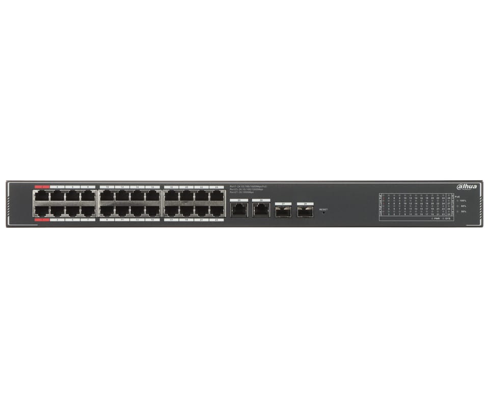 | Porty lan: | 24 x RJ45 10/100/1000 Base-T ( 2 x Hi-PoE / PoE (802.3bt) + 22 x PoE (802.3af/at) ), 2 x RJ45 10/100/1000 Base-T - Uplink, 2 x SFP 1000 Base-X - Uplink |