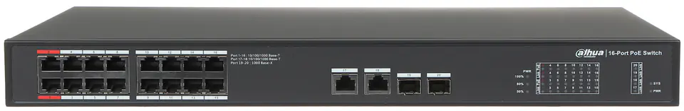 Switch PoE PFS3220-16GT-240-V2 to urządzenie typu przemysłowego zapewniające płynną transmisję sieciową z prędkością 10 / 100 / 1000 Mbps
