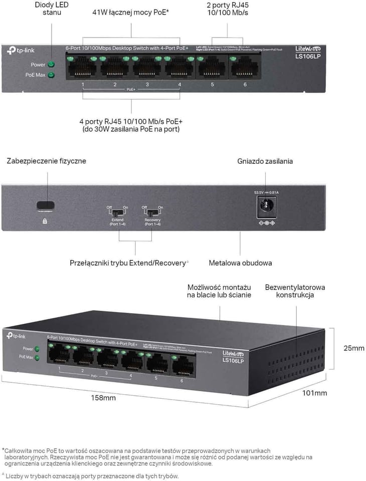 TP-Link LS106LP oferuje 4 porty RJ45 10/100 Mb/s z obsługą PoE+, z maksymalną mocą do 30W na każdy port, co pozwala na zasilanie urządzeń takich jak kamery IP, punkty dostępowe i telefony IP przez jeden kabel Ethernet. Łączna moc PoE wynosi do 41W. W trybie Extend zasięg transmisji danych i zasilania PoE może osiągnąć do 250 metrów, idealnie sprawdzając się w przypadku monitoringu na dużych obszarach. Funkcja automatycznego restartowania urządzeń PoE zapewnia niezawodność działania sieci. Instalacja jest szybka i łatwa dzięki funkcji Plug and Play – wystarczy podłączyć kabel Ethernet. Bezwentylatorowa konstrukcja zapewnia cichą pracę i mniejsze zużycie energii, co sprawia, że urządzenie jest idealne zarówno do domów, jak i małych firm. Możliwość montażu na blacie lub ścianie zwiększa elastyczność w aranżacji przestrzeni.
