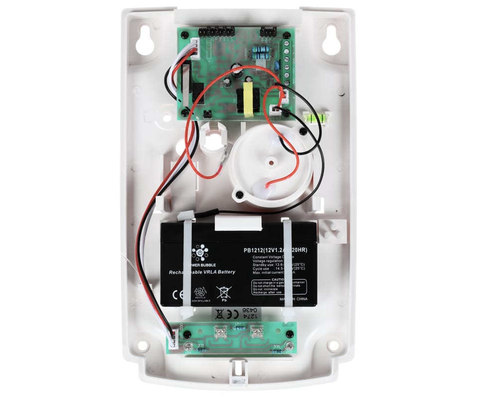 Sygnalizator zewnętrzny MR-100B/W z akumulatorem 12V 1.2Ah zapewnia głośny alarm 115 dB i sygnalizację dwiema superjasnymi diodami LED. Zasilanie 12V DC, oddzielne wejścia akustyczne i optyczne, wybór tonu i czasu 1/4/16 min oraz 3 tryby migania. Obudowa PC+ABS i podwójny tamper - otwarcie i oderwanie - zwiększają odporność i bezpieczeństwo.