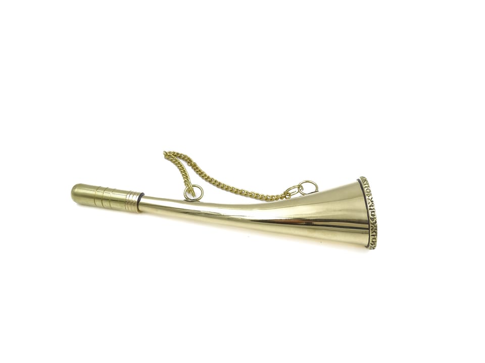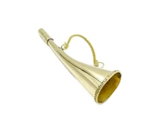 Sygnałówka mosiężna z łańcuszkiem - róg mgłowy MIKB10/8 Sygnałówka MIKB10/8 specyfikacja: Wymiary: 22 cm Materiał: mosiądz Kolor: złotawy Mocowanie: łańcuszek