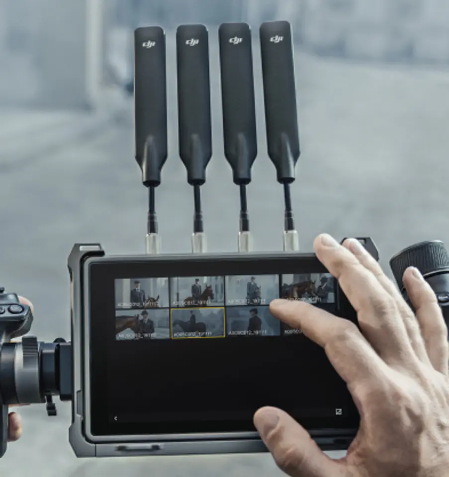 Zdalny monitor podglądowy DJI High-Bright Remote Monitor obsługuje transmisję na żywo 1080p/60FPS. Umożliwia korzystanie z jednego nadajnika i wielu odbiorników, możesz też używać go razem z Ronin 4D Hand Grips, DJI Master Wheels i DJI Force Pro. Został również wyposażony w czujnik żyroskopowy, dzięki któremu da się zmienić go w samodzielny kontroler ruchu do sterowania gimbalem.