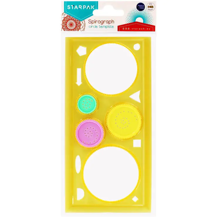 Szablon z różnymi wielkościami kół, kółek. Szablon umożliwia dzieciom rysowanie precyzyjnych kształtów, a następnie zabawę, np. kolorowanie. Z boku szablonu umieszczona jest linijka 20 cm. Wykonany z trwałego przezroczystego tworzywa. Produkt pakowany w folię z zawieszką. Występuje w czterech wariantach kolorystycznych: różowym, zielonym, niebieskim, żółtym.