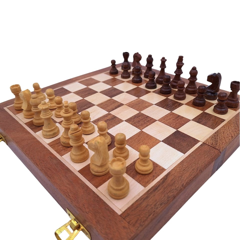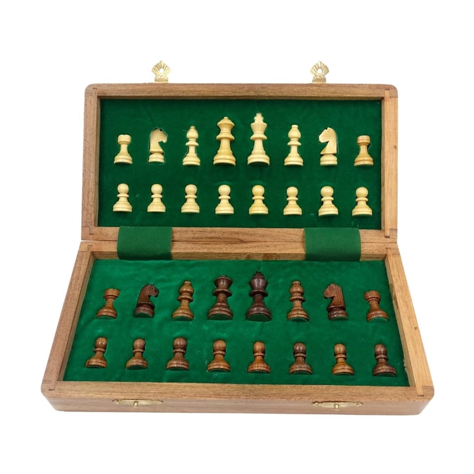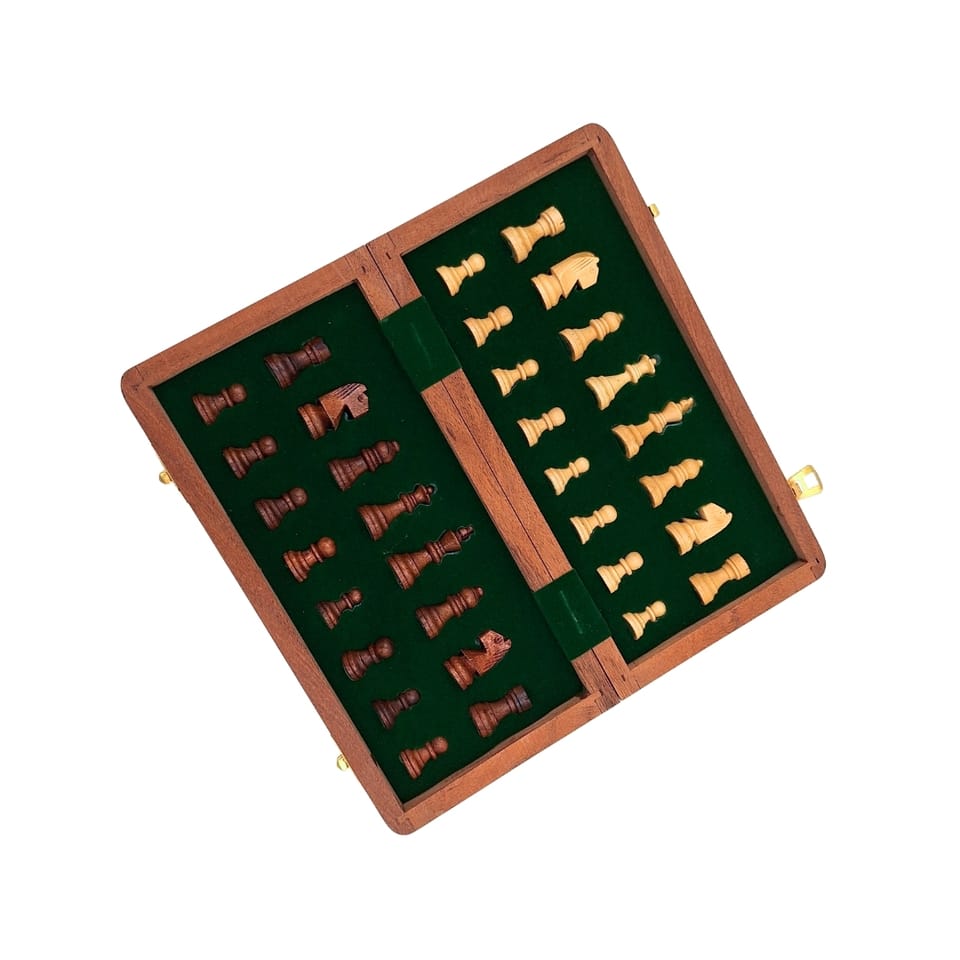 Szachy Drewniane Magnetyczne 30x30cm Składane - G614 Nasze szachy G614 to połączenie klasycznej estetyki z praktycznymi rozwiązaniami. Wykonane z eleganckiego palisandru indyjskiego i wyposażone w magnetyczne figury, gwarantują komfortową grę i stabilność na planszy, nawet w podróży. Solidne, mosiężne zawiasy i zatrzask zapewniają trwałość, a przestrzeń wewnątrz szachownicy pozwala na bezpieczne przechowywanie bierek. Informacje o produkcie: Szachownica: • Wymiary (rozłożona): 30 cm x 30 cm • Materiał: Drewno (palisander indyjski) • Kolory: Brąz i beż • Konstrukcja: Składana z mosiężnymi zawiasami i zatrzaskiem • Przechowywanie: Miejsce wewnątrz do przechowywania bierek Bierki szachowe: • Materiał: Drewno (palisander indyjski) • Wysokość Króla: 5,5 cm • Cechy: Magnetyczne, podklejone materiałem dla ochrony planszy. Dlaczego warto? • Magnetyczne Figury: Bierki są namagnetyzowane, dzięki czemu trzymają się szachownicy. To kluczowa cecha, która zapobiega przypadkowemu przesuwaniu figur i poprawia komfort gry. • Wysoka Jakość Materiałów: Zarówno szachownica, jak i bierki wykonane są ze szlachetnego palisandru indyjskiego. Mosiężne zawiasy i zamknięcie zapewniają trwałość i elegancki wygląd. • Praktyczny Rozmiar i Design: Średniej wielkości szachownica (30x30 cm) jest idealna do gry w domu, w ogrodzie czy w podróży. Składana konstrukcja ułatwia przechowywanie i transport. • Edukacyjna Wartość: Gra w szachy to najlepszy trening umysłowy. Rozwija cierpliwość, koncentrację, pamięć, logiczne myślenie, strategiczne planowanie i umiejętności analityczne. • Bezpieczne Przechowywanie: Wewnątrz szachownicy znajduje się specjalne miejsce do przechowywania bierek, które są dodatkowo podklejone materiałem, chroniącym je przed zarysowaniami. • Idealny Pomysł na Prezent: To doskonały upominek na każdą okazję – urodziny, imieniny, Dzień Dziecka, święta. Idealny prezent dla każdego, kto ceni intelektualne wyzwania i klasyczną rozrywkę.