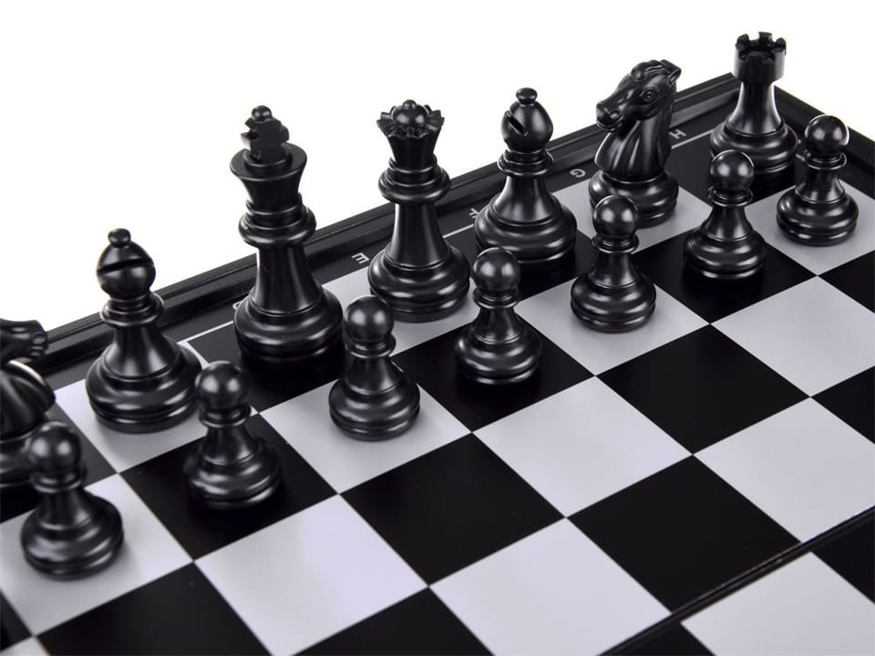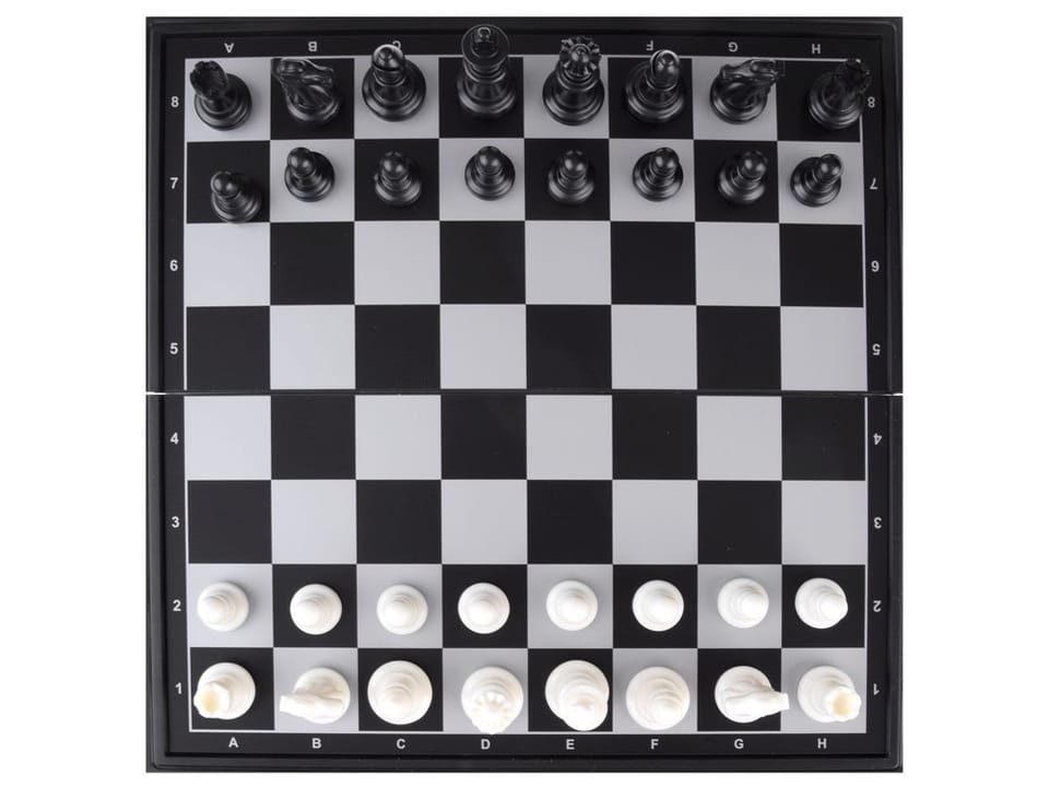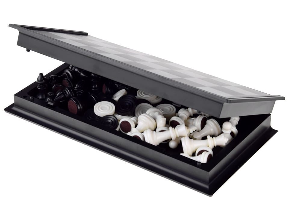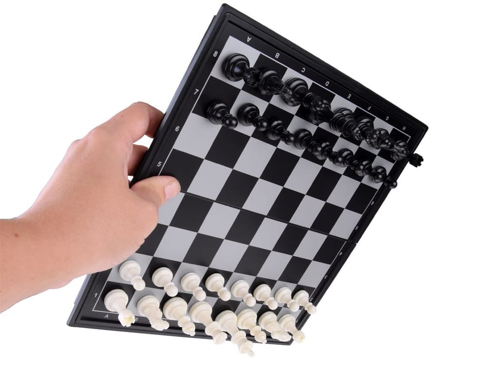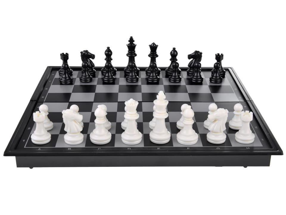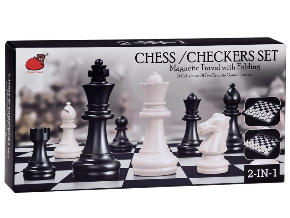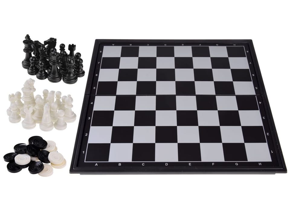 Zestaw zawiera:- 32 pionki do gry w szachy (posiadają magnes)- 24 pionki do gry w warcaby (nie posiadają magnesu)- magnetyczna plansza/pudełko