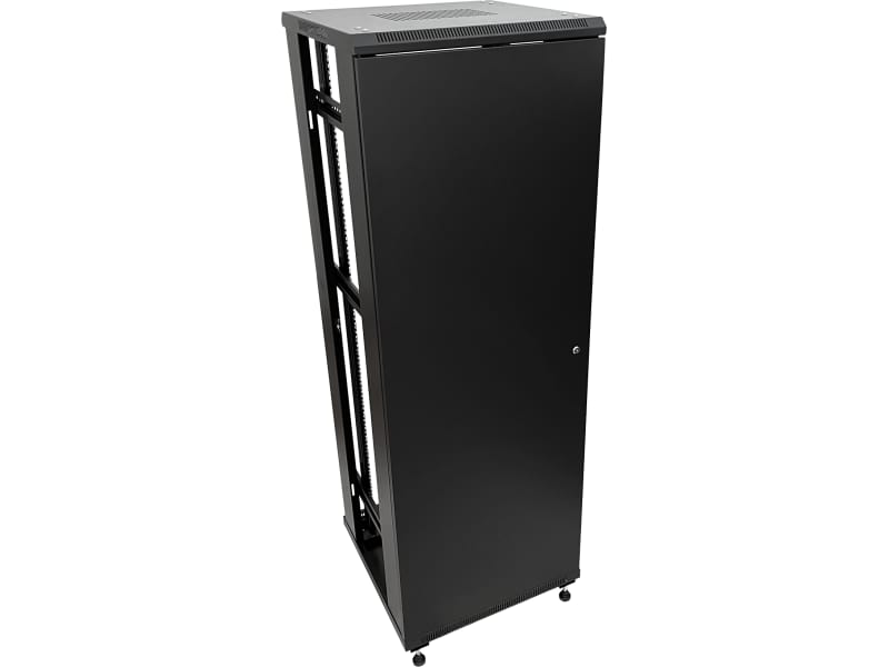 Szafa teletechniczna RACK, stojąca, 19", do stosowania wewnątrzbudynkowego przeznaczona do montażu elementów pasywnych i aktywnych okablowania strukturalnego, zasilania awaryjnego oraz CCTV. Drzwi przednie wyposażone są w zamek zapobiegający dostępowi przez osoby niepowołane. Osłony boczne posiadają zatrzaski ułatwiające ich demontaż oraz zamek. Elementy szafy są malowane proszkowo. Możliwość zamontowania cokołu lub kółek jezdnych - opcja.