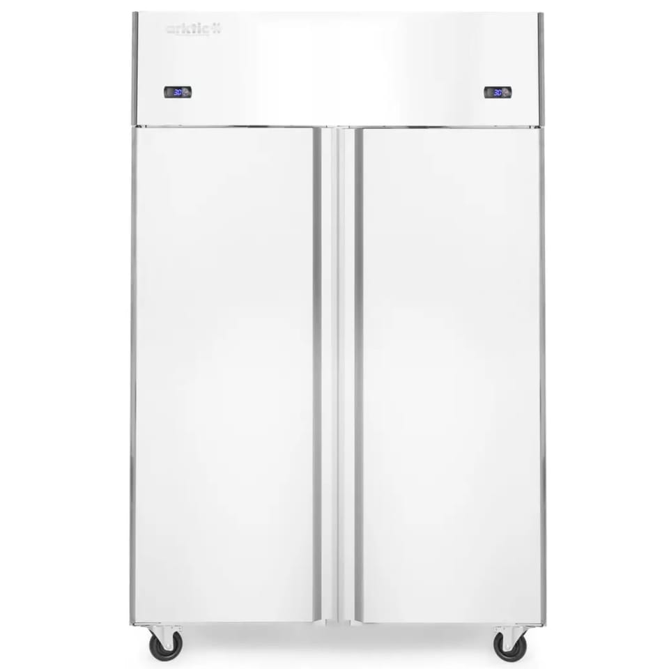 Kod produktu: 1001041Szafa chłodniczo-mroźnicza Arktic z agregatem Embraco zapewnia niezawodne chłodzenie i zamrażanie. Dzięki wymuszonemu chłodzeniu, elektronicznemu sterowaniu oraz automatycznemu odparowywaniu skroplin zapewnia niezawodną i stabilną pracę. Samozamykające się, nieprzestawne drzwi wyposażone w zamek zapewniają mniejsze zużycie energii. Urządzenie posiada 4 koła (w tym 2 z hamulcami), co ułatwia przemieszczanie i ustawianie. Cyfrowy wyświetlacz i elektroniczny termostat ułatwiają obsługę.Cechy produktu: