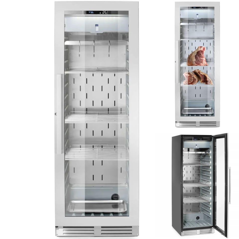 Kod producenta: 204962Szafa do sezonowania mięsa firmy HENDI oferuje kontrolowane środowisko do dojrzewania mięsa, dzięki któremu można uzyskać niezwykle kruche i smaczne mięso. Szafa została zaprojektowana tak, by doskonale odwzorować mikroklimat wykorzystywany do tradycyjnego, naturalnego dojrzewania mięsa. Równocześnie, innowacyjna technologia umożliwia stałą kontrolę nad procesem sezonowania poprzez utrzymywanie stabilnej wentylacji, regulowanej wilgotności powietrza oraz sterylizacji. Przeszklenie drzwi zostały wykonane z 2 warstw hartowanego szkła powlekanego niskoemisyjnego, co zwiększa wydajność energetyczną szafy poprzez blokowanie promieniowania UV oraz przedostawania się ciepła z zewnątrz. Pojemnik na wodę destylowaną wykonany jest z tworzywa ABS - wodę destylowaną należy uzupełnić ręcznie. Urządzenie posiada dwa alarmy: alarm dźwiękowy, który sygnalizuje niską wilgotność poniżej 15% i konieczność uzupełnienia wody oraz alarm sygnalizujący drzwi pozostające otwarte przez więcej niż 3,5 minuty. Jest to zabezpieczenie przed niekontrolowanym zaburzeniem warunków panujących w komorze. Wbudowana lampa UVC do sterylizacji zapobiega rozwojowi bakterii i gwarantuje bezpieczne środowiska dla mięsa. Po otwarciu drzwi szafy w trakcie procesu sezonowania bakterie nie będą miały szansy się rozwinąć. Chłodzenie wymuszone wentylatorem zapewnia odpowiedni poziom cyrkulacji powietrza. Obudowa, rama drzwi i uchwyt drzwi oraz akcesoria zostały wykonane ze stali nierdzewnej AISI 304.Cechy produktu: