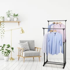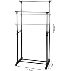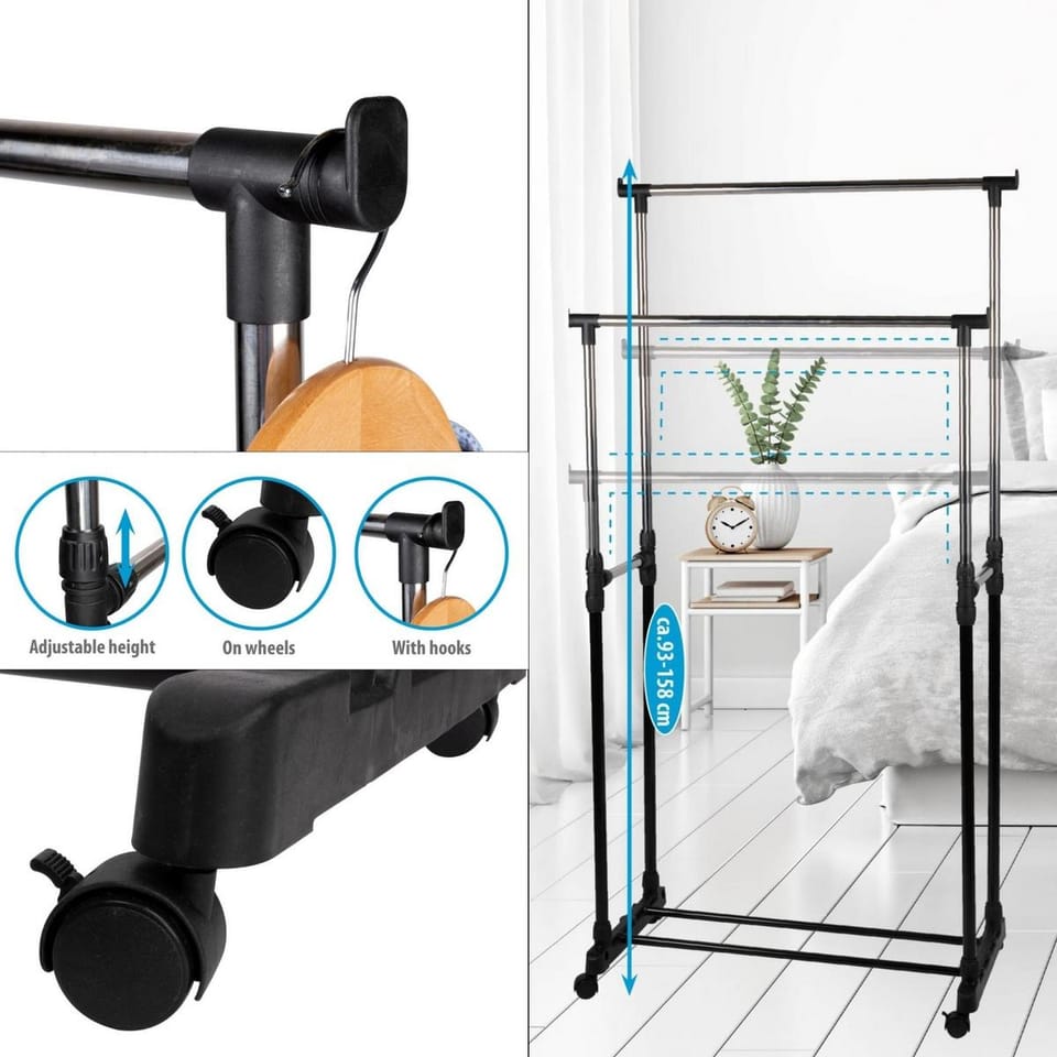 - regulowana wysokość pozwala dostosować wieszak do różnych długości ubrańdwa poziome drążki pozwalają pomieścić więcej ubrań na tej samej powierzchnikółka 360° oferują łatwe przesuwanie po podłodzeminimalistyczny design sprawia, że pasuje do każdego wnętrzaotwarta struktura ułatwia dostęp do ubrańłatwy i prosty w montażu