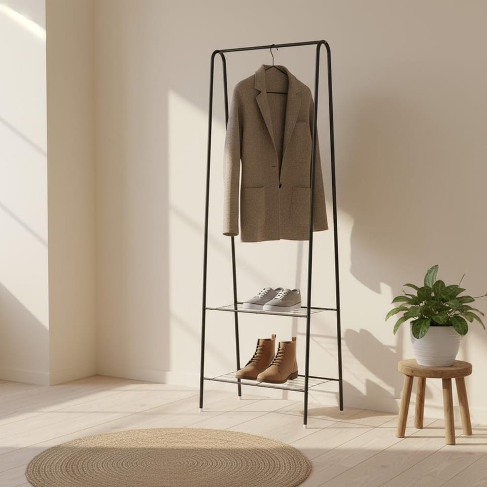 Szukasz lekkiej, praktycznej garderoby, która uporządkuje ubrania i buty w jednym miejscu? Ten wieszak z dwiema półkami to funkcjonalne i eleganckie rozwiązanie idealne do każdego mieszkania — minimalistyczny, stabilny i gotowy na codzienne użytkowanie.