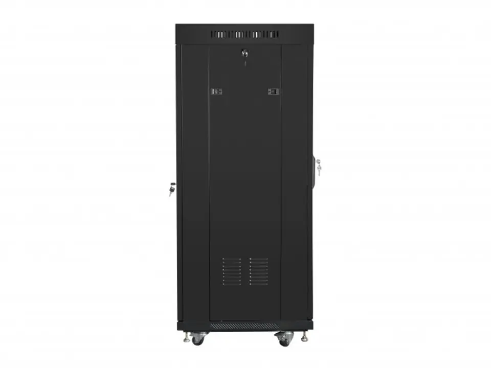 Szafa stojąca jednosekcyjna Lanberg FF01-6627-12BL to rozwiązanie przeznaczone do budowy sieci, montażu okablowania oraz sprzętu w rozmiarze 19” o maksymalnym łącznym udźwigu do 800 kg. Może być stosowana w centrach danych, które wymagają dużej ilości miejsca w szafach na urządzenia. Szafa z powodzeniem spełni swoją rolę w dużych, rozbudowanych sieciach i serwerowniach, zarówno w małych, średnich jak i dużych firmach oraz korporacjach. Sprawdzi się również w instalacjach niskoprądowych takich jak sieci telewizji kablowych, systemy alarmowe, przeciwpożarowe, kontroli dostępu oraz systemy monitoringu CCTV i IP. Konstrukcja wykonana jest przy użyciu wysokiej jakości stali walcowanej, charakteryzuje się znakomitym designem i jakością wykonania. Szafa umożliwia pełną regulację głębokości pionowych szyn montażowych. Wyposażona jest w przednie drzwi ze szkła hartowanego z zamkiem, z możliwością montażu prawo lub lewo stronnego. Posiada zdejmowane boczne panele (z zamkami w zestawie) i tylne solidne stalowe drzwi z zamkiem. Istnieje możliwość wprowadzenia okablowania poprzez zamykany górny i dolny panel (z zaślepkami w zestawie). Szafa posiada zamontowany na przodzie wyświetlacz LCD, wyświetlającym podstawowe informacje (np. temperaturę wewnątrz szafy, obecny czas oraz aktualny status pracy wentylatorów) o statusie działania urządzenia.W zestawie znajduje się panel wentylacyjny z 2 wentylatorami 230V. Dodatkowo w komplecie załączone są akcesoria do mocowania szyn nośnych, śruby M6 oraz zaślepki paneli wejściowych, a dzięki konstrukcji do samodzielnego montażu (flat pack), całość znajduje się w 3 płaskich opakowaniach co ułatwia transport.Cechy:- Producent: Lanberg,- Kod producenta: FF01-6627-12BL,- Typ szafy: Stojąca,- Kolor: Czarny RAL9004,- Wysokość: 27U,- Wymiary szafy (S x G x W): 600x600x1431 mm,- Wysokość (górny panel - dolny panel): 1352 mm,- Wysokość (górny panel - podłoże): 1425 mm,- Wysokość (górny panel - podłoże uwzględniając śruby): 1431 mm,- Wyświetlacz LCD: Tak,- Panel podłogowy: 4 kółka z hamulcem + regulowane nóżki,- Wewnętrzna szerokość rozstawu między szynami rackowymi: 450 mm,- Szerokość rozstawu między otworami szyn rackowych: 465 mm,- Zewnętrzna szerokość między szynami rackowymi: 500 mm,- Ładowność: Do 800 KG,- Klasa szczelności: IP20,- Panel wentylacyjny: w zestawie 2 wentylatory 230V w górnej obudowie,- Rodzaj drzwi: Przednie - Szyba hartowana, Tylnie - Stalowe,- Zgodność ze standardami: ANSI/EIA RS-310D, IEC297-2, DIN41494; PART1 & PART7, ETSI,- Materiał wykonania: Wysokiej jakości stal walcowana, malowana proszkowo,- Grubość drzwi: 5.0 mm,- Grubość blachy: pionowe szyny montażowe - 2,00 mm; profil montażowy - 2,00 mm; reszta - 1,50 mm - 1,20 mm,- Otwory kablowe: Góra, Dół (regulowany),- W zestawie: Akcesoria do mocowania, zamek drzwi przednich i tylnych, dwa zamki paneli bocznych, 20 śrub M6.