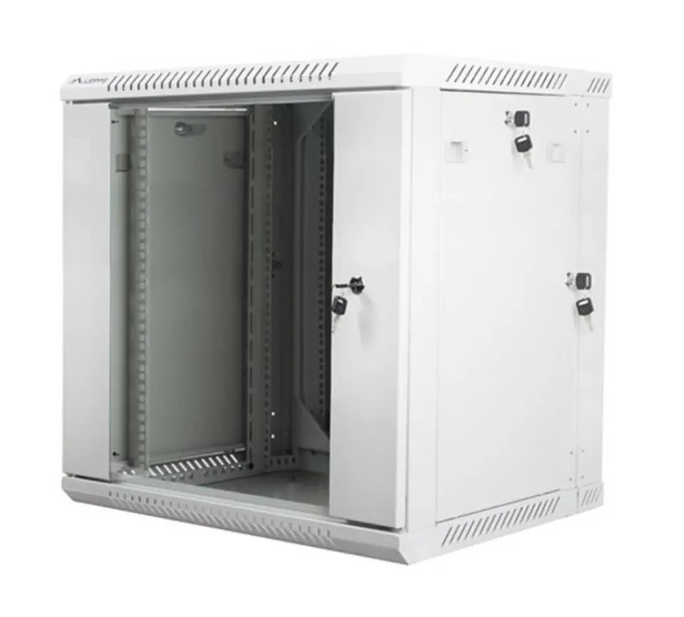 Wisząca szafa rack 19 cali. Maksymalna ładowność: 60 kg. Zgodność z normami ANSI/EIA RS-310-D, IEC297-2, DIN41494; PART1 & PART7, ETSI. Materiał wykonania: stal walcowana, malowana proszkowo.