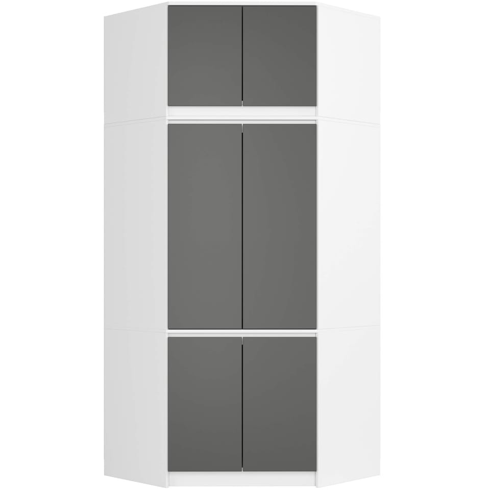Szafa narożna z nadstawką ubraniowa sześciodrzwiowa wykonana została z odpornej na ścieranie płyty laminowanej Kronospan. Korpus mebla stanowi płyta w kolorze białym, fronty pokryte są laminatem szarym. Szafa składa się z 2 segmentów. Dolny to cztery drzwi, 6 półek oraz drążek na ubrania wiszące. Umieszczony najwyżej segment stanowi nadstawka zamykana dwojgiem drzwi. Nadstawka wyposażona jest w 3 półki.