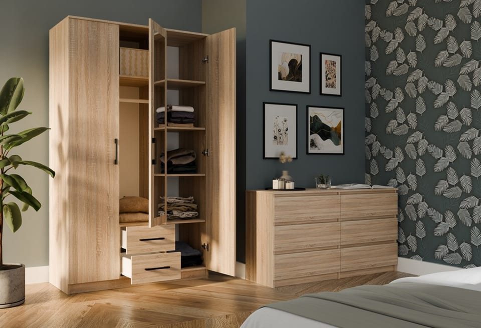 - 3-drzwiowa konstrukcja z podziałem na funkcjonalne strefy: przestrzeń na wieszaki, pojemne półki oraz praktyczne szuflady.