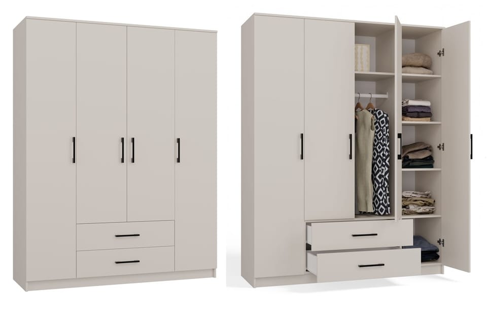 - Duża pojemność: Przestronny układ wewnętrzny z półkami oraz drążkiem na ubrania sprawia, że szafa idealnie nadaje się do przechowywania zarówno odzieży wiszącej, jak i składanej. Dodatkowo, dwie szuflady pozwalają na wygodne przechowywanie bielizny czy akcesoriów.