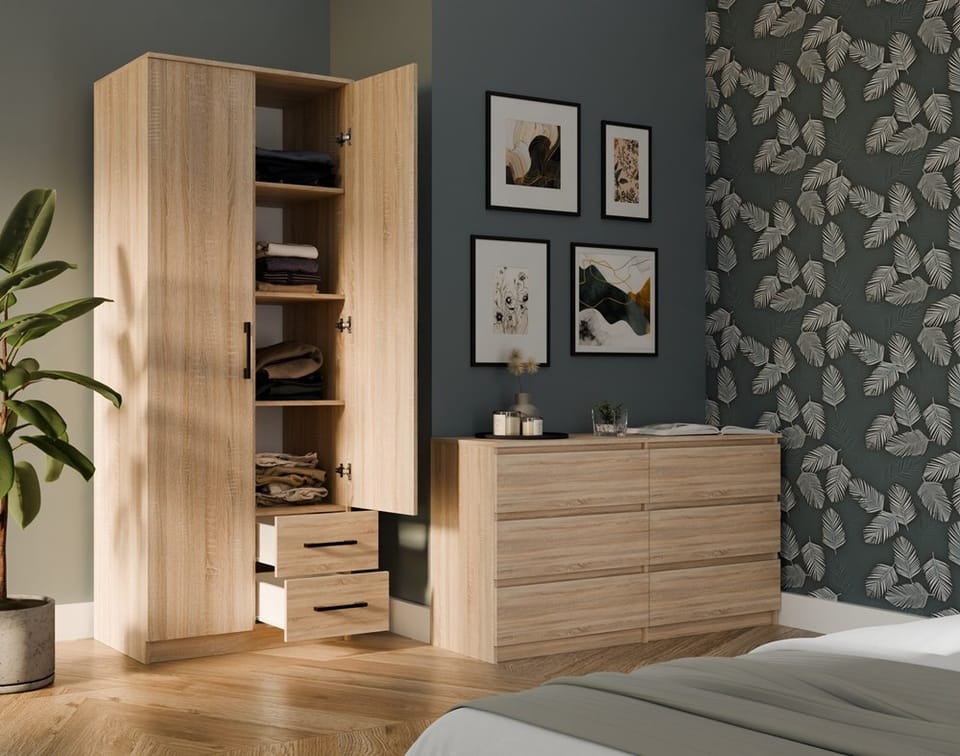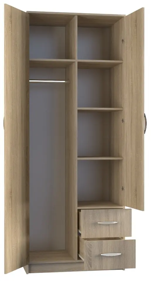 - Przestronne półki – idealne na odzież, dokumenty i akcesoria