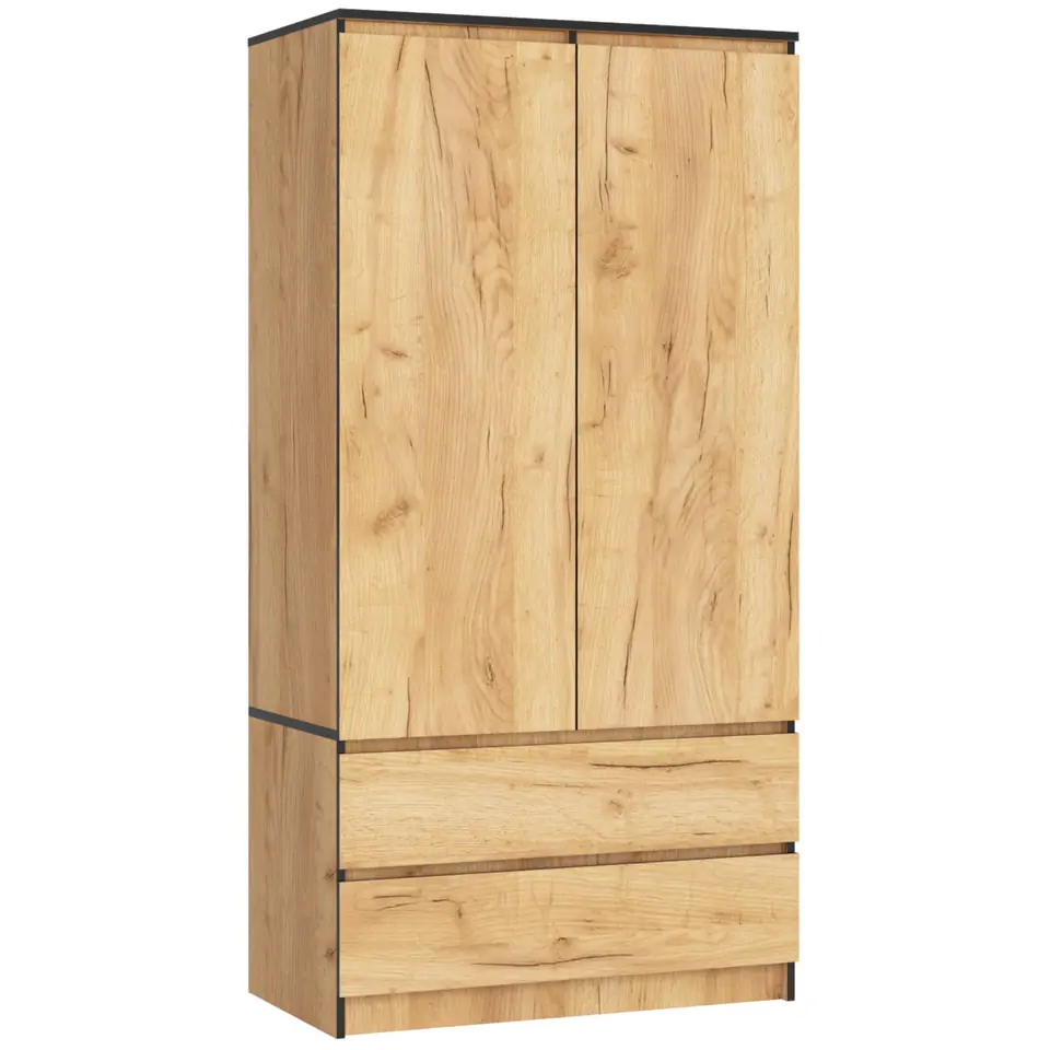Dwudrzwiowa szafa ubraniowa wykonana została z odpornej na ścieranie płyty laminowanej. Korpus mebla utrzymany został w całości w kolorze dąb craft. Dolna część szafy to dwie szuflady ułożone równolegle jedna nad drugą, natomiast górny, wyższy segment podzielony został na dwie części. Lewa to rząd 4 półek, natomiast prawa, wyposażona w drążek przeznaczona została na ubrania wiszące.