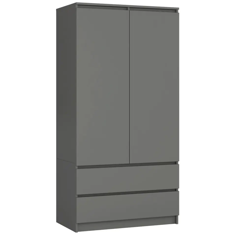Dwudrzwiowa szafa ubraniowa wykonana została z odpornej na ścieranie płyty laminowanej. Korpus mebla utrzymany został w całości w kolorze grafit szary. Dolna część szafy to dwie szuflady ułożone równolegle jedna nad drugą, natomiast górny, wyższy segment podzielony został na dwie części. Lewa to rząd 4 półek, natomiast prawa, wyposażona w drążek przeznaczona została na ubrania wiszące.