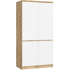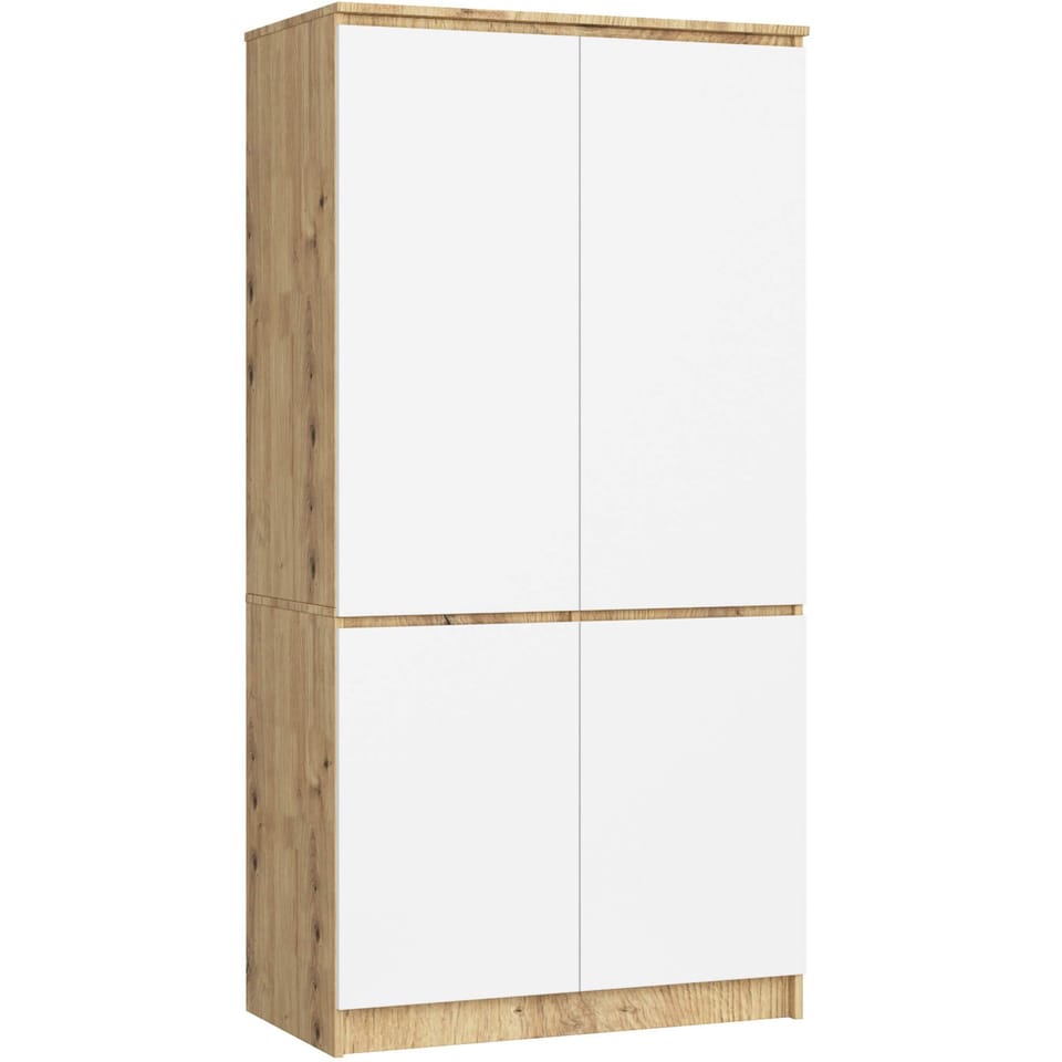 Szafa czterodrzwiowa to uniwersalny i praktyczny mebel, który znakomicie uzupełni wyposażenie sypialni, przedpokoju czy pokoju dziennego we wnętrzach typu studio. Eleganckie wykończenie oraz kolorystyka dąb artisan białe fronty sprawia, że szafa idealnie wkomponuje się w aranżację klasyczną i nowoczesną. Szafa wyposażona została w pojemne półki, które znakomicie nadają się do przechowywania elementów garderoby lub zapasowych poszew na kołdry i poduszki, prześcieradeł, obrusów czy koców. W części mebla umieszczonej za uchylnymi drzwiami znajduje się drążek na wieszaki. Półki można przeznaczyć na swetry, bluzki, torebki, ale także na przykład na ręczniki. Z kolei drążek sprawdzi się jako miejsce do zawieszenia garniturów, sukienek, spódnic oraz odzieży wierzchniej, takiej jak płaszcze lub kurtki. Mebel charakteryzuje się starannym wykonaniem z najwyższej jakości płyty laminowanej, która jest odporna na ścieranie. Krawędzie szafy zostały wykończone estetycznym obrzeżem ABS.