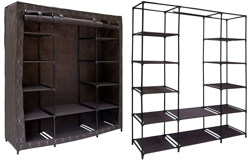 Szafa tekstylna z 12 półkamiModel: KAJA MAXI | Kolor: brązowy Lekkie szafy tekstylne to proste i ekonomiczne rozwiązanie problemu przechowywania odzieży. Szafy mają metalowy stelaż z łącznikami z tworzywa sztucznego, są proste i szybkie w montażu oraz dostępne w wielu modnych kolorach i wzorach. Materiałowa garderoba sprawdzi się też u osób często zmieniających miejsce zamieszkania - składa się ją w kilka minut. Dzięki zamkom błyskawicznym na froncie szafy, poszczególne części można otwierać i zamykać niezależnie. Cechy produktu10 półek - po 5 na każdym boku2 półki po środku na doleDwie kieszenie boczneMiejsce na wieszaki (drążek po środku)Zamknięcia na zamek błyskawicznyMateriał przepuszczający powietrze!Metalowy stelaż Wymiary produktuWysokość: 175 cmSzerokość: 150 cmGłębokość: 45 cm Informacje dodatkowePrzedstawione kolory należy traktować poglądowo - mogą odbiegać od rzeczywistych ze względu na różne ustawienia monitorów oraz proces obróbki zdjęć. Rzeczywiste wymiary mogą się różnić od podanych wyżej. Tolerancja błędów może wynosić +/- 5%. Marka:GockowiakKod produktu:301883MGKolor:brązowyWysokość: 175 cmSzerokość:150 cmMateriał:tekstylnyMateriał stelaża:metalPrzeznaczenie:pokój | sypialnia | salon | biuroDo samodzielnego montażu:tak