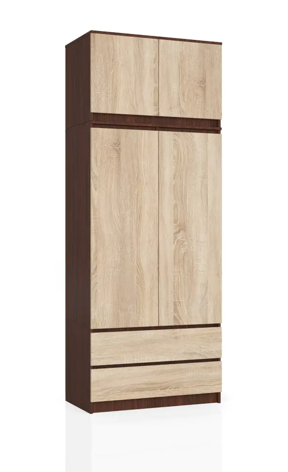 Dwudrzwiowa szafa S 90 cm w kolorze wenge z frontami w stylu sonoma, dzięki wyposażeniu w specjalną nadstawkę, a także dwie praktyczne szuflady, umieszczone na metalowych prowadnicach marki GTV, zapewnia wystarczającą przestrzeń do przechowywania. Klasyczny i elegancki charakter sprawia, że z powodzeniem mebel można umieścić nie tylko w sypialni bądź pokoju dziennym, ale także w przedpokoju, pracowni lub dowolnej przestrzeni biurowej. Dosłownie wszędzie tam, gdzie zachodzi konieczność zastosowania tego typu produktu. Do grona wielu zalet, jakie posiada omawiany model szafy, możemy zaliczyć: