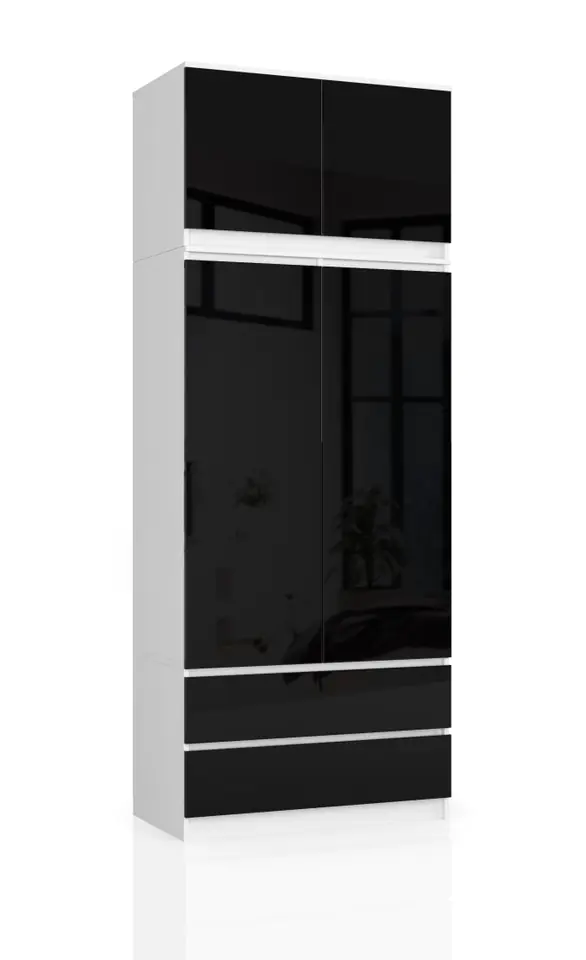 SZAFA Z NADSTAWKĄ S 90 cm 2 DRZWI 2 SZUFLADY BIAŁA / CZARNY POŁYSK to niezwykle funkcjonalny mebel. Zastosowano w niej różne schowki do przechowywania różnego rodzaju rzeczy. Nadstawka z powodzeniem pomieści większe gabarytowo rzeczy jak koc czy zapasowa pościel. W środkowej części szafy wydzielono przestrzeń z drążkiem na wieszaki oraz strefę z kilkoma półkami na ubrania o mniejszych gabarytach. W dolnej części szafy znajdują się szuflady. Pomieszczą one zarówno buty, jak i małe akcesoria domowe.