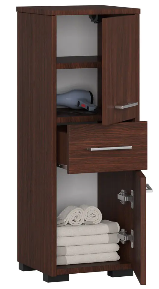 Prezentowany słupek łazienkowy został wykonany z płyty laminowanej o grubości 16 mm. Ten rodzaj tworzywa jest odporny na ścieranie, co jest niezwykle ważne w przypadku obecności dzieci. Krawędzie mebla zostały oklejone obrzeżem ABS, co zwiększa trwałość. Wysoka szafka powinna znaleźć się w każdej łazience z uwagi na swoją funkcjonalność. W tym pomieszczeniu nie za dużo miejsca, więc trzeba dobrze zagospodarować przestrzeń. Słupek łazienkowy jest podzielony na 2 części. W górnej szafce znajdują się 3 pojemne półki. Można poukładać w nich ręczniki, perfumy czy inne akcesoria przydatne w każdej łazience. W dolnej szafce znajdują się 2 półki, które są odpowiednie do rozmieszczenia środków czystości. Cały mebel bardzo dobrze się prezentuje i nadaje poszczeniu klasy. Kolor biały znów staje się bardzo modny i dobrze komponuje się z innymi kolorami. Do otwarcia szafki zamontowane zostały 2 klasyczne uchwyty. Jeden służy do otwarcia części górnej, a drugi dolnej. To bardzo praktyczne i wygodne rozwiązanie.