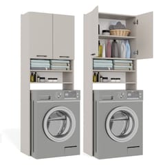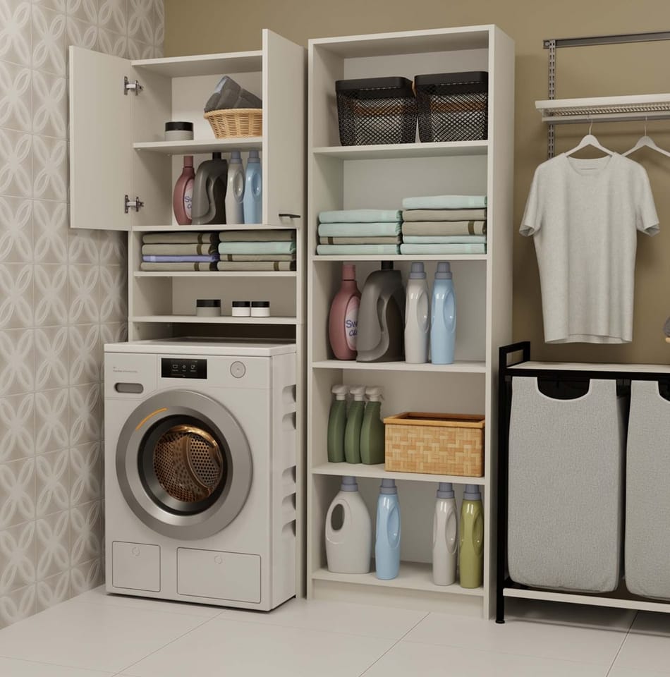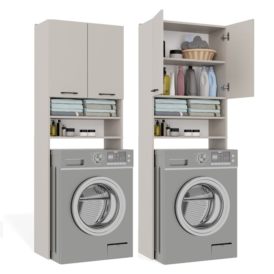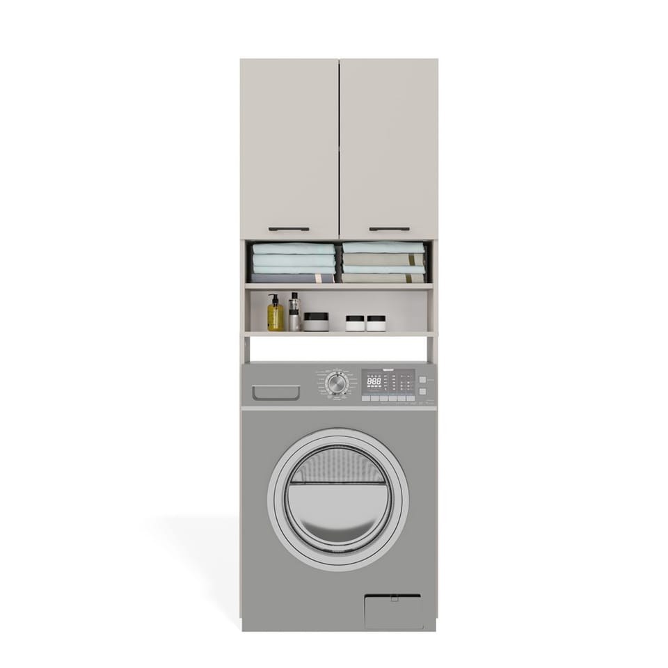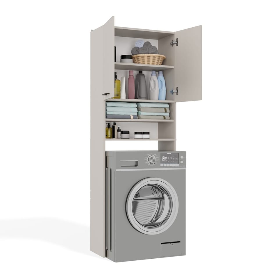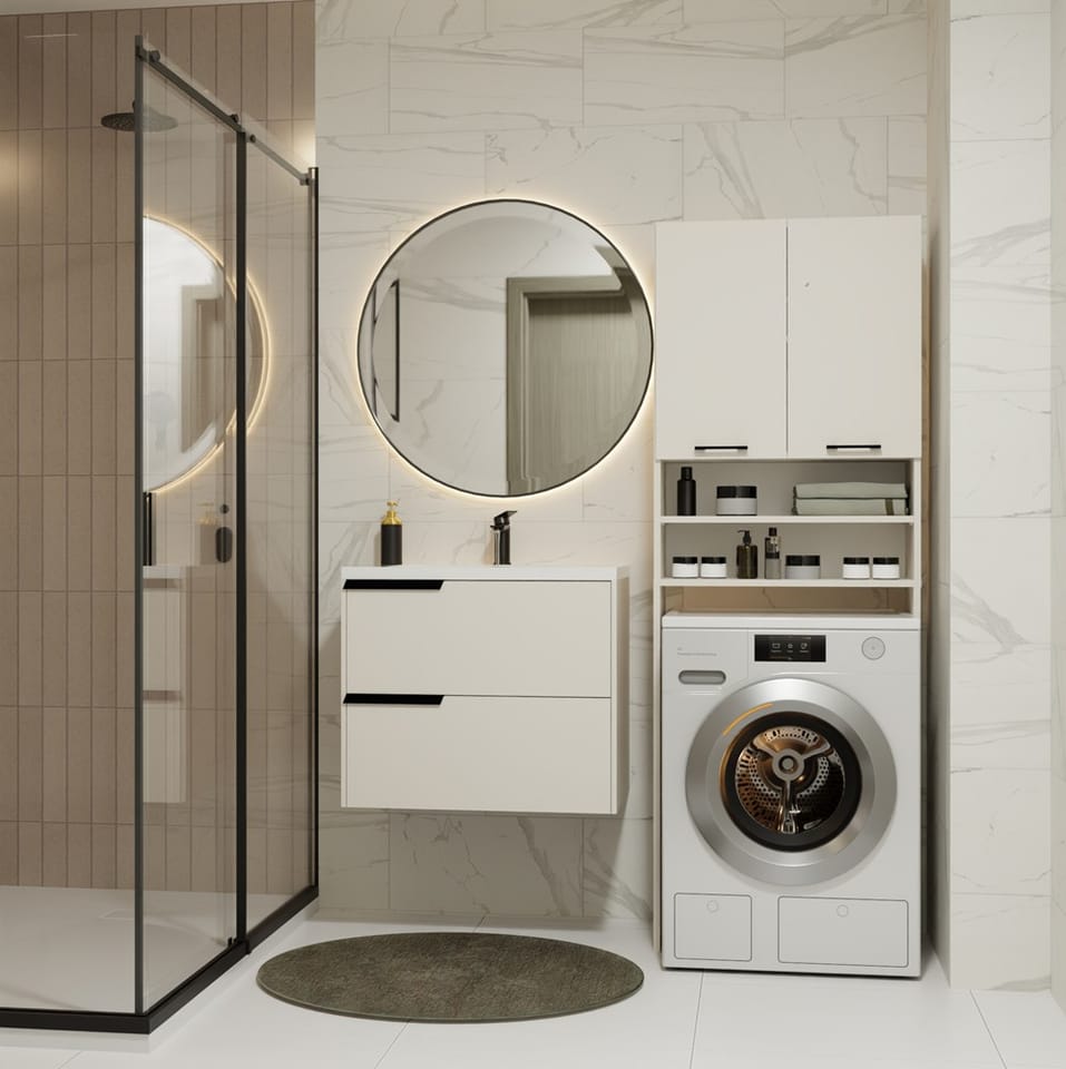 - 4 pojemne półki, w tym 2 schowane za drzwiami – idealne na ręczniki, detergenty i akcesoria.