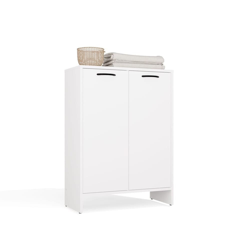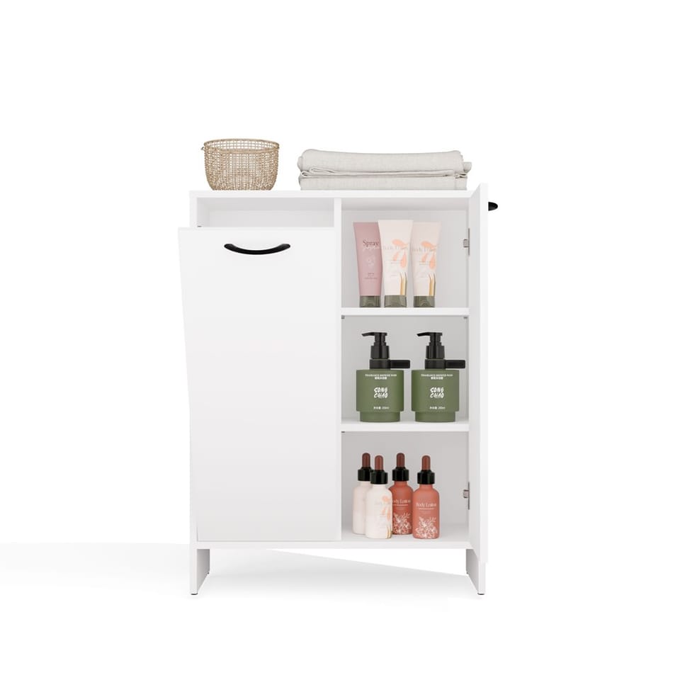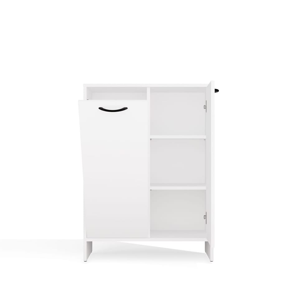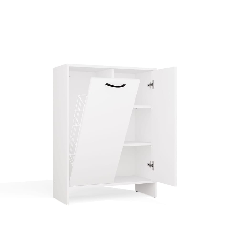 Nowoczesna i funkcjonalna szafka łazienkowa NINA 1K1D to idealne rozwiązanie do przechowywania kosmetyków, środków czystości i brudnej odzieży w jednym miejscu. Mebel łączy zalety dwóch modeli – po jednej stronie znajduje się praktyczny kosz na pranie, a po drugiej trzy pojemne półki ukryte za pełnymi drzwiczkami. To wszystko w minimalistycznej, białej formie z czarnymi uchwytami, która świetnie odnajdzie się w każdej łazienkowej aranżacji.