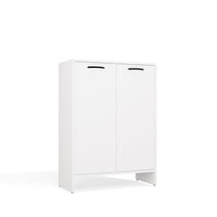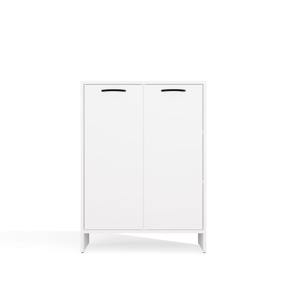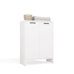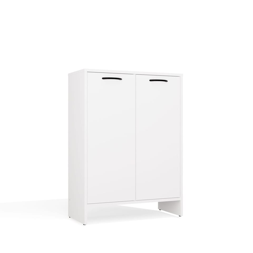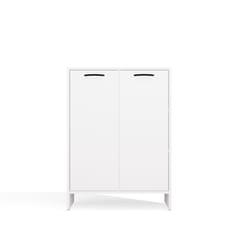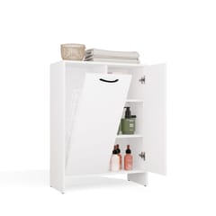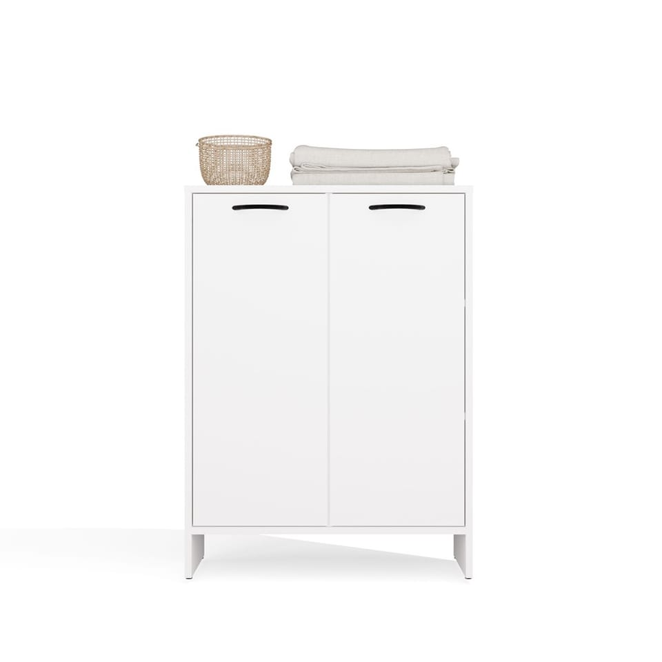Nowoczesna i funkcjonalna szafka łazienkowa NINA 1K1D to idealne rozwiązanie do przechowywania kosmetyków, środków czystości i brudnej odzieży w jednym miejscu. Mebel łączy zalety dwóch modeli – po jednej stronie znajduje się praktyczny kosz na pranie, a po drugiej trzy pojemne półki ukryte za pełnymi drzwiczkami. To wszystko w minimalistycznej, białej formie z czarnymi uchwytami, która świetnie odnajdzie się w każdej łazienkowej aranżacji.